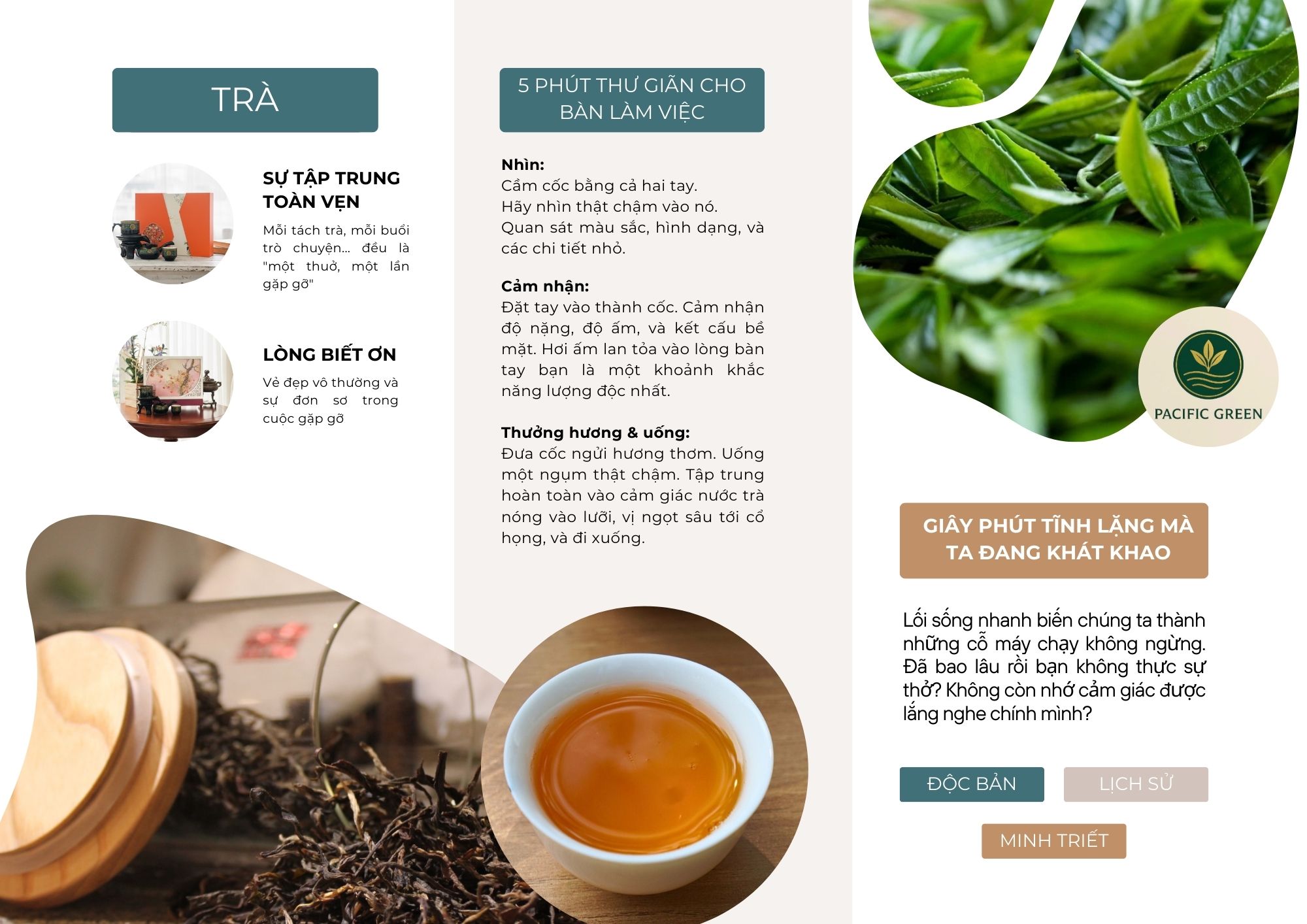 Cảm giác lắng đọng: Tính chất ấm của trà giúp làm dịu hệ thần kinh, tạo ra cảm giác bình yên, thiền định. Uống trà trở thành một phương pháp tìm về sự an tĩnh nội tại.